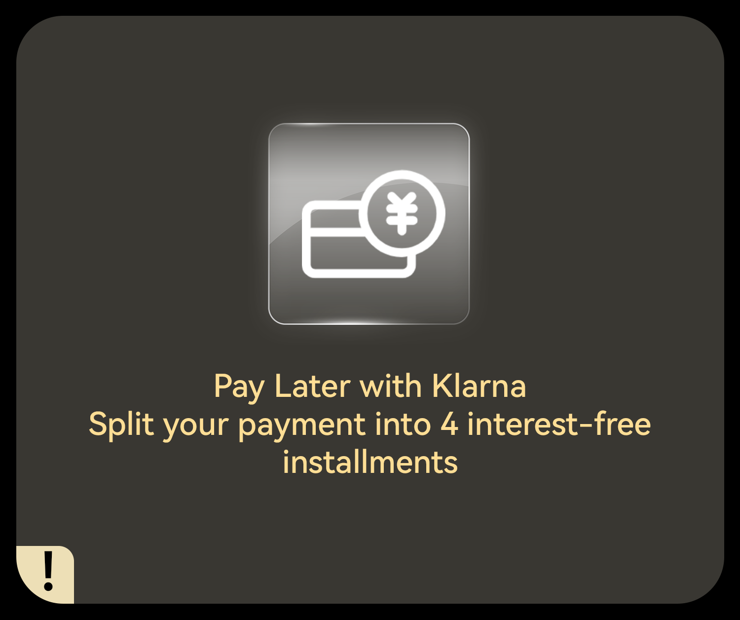 At checkout, simply select Klarna as your payment method. You'll pay just the first installment today, and the rest will be charged automatically every two weeks — interest-free。