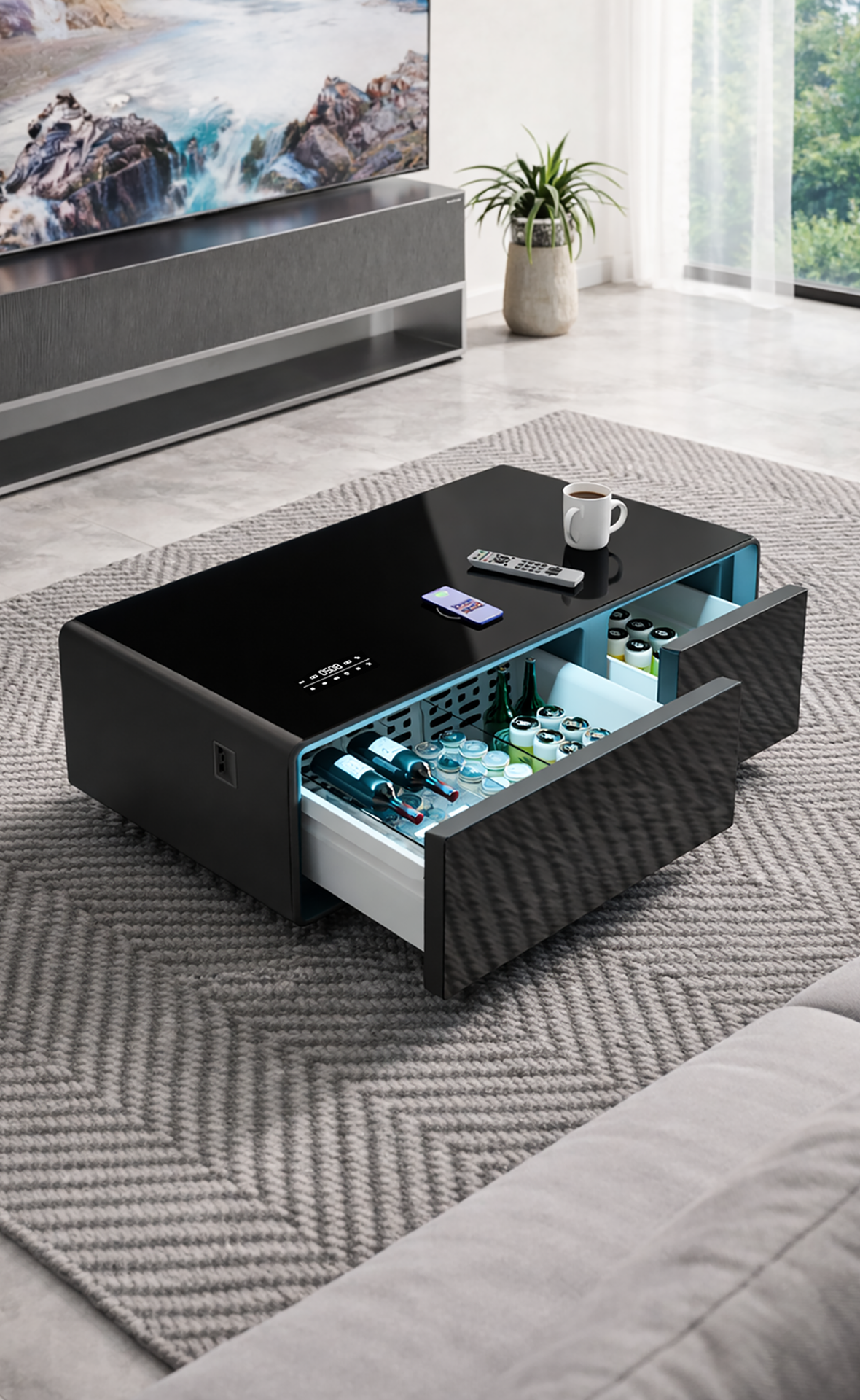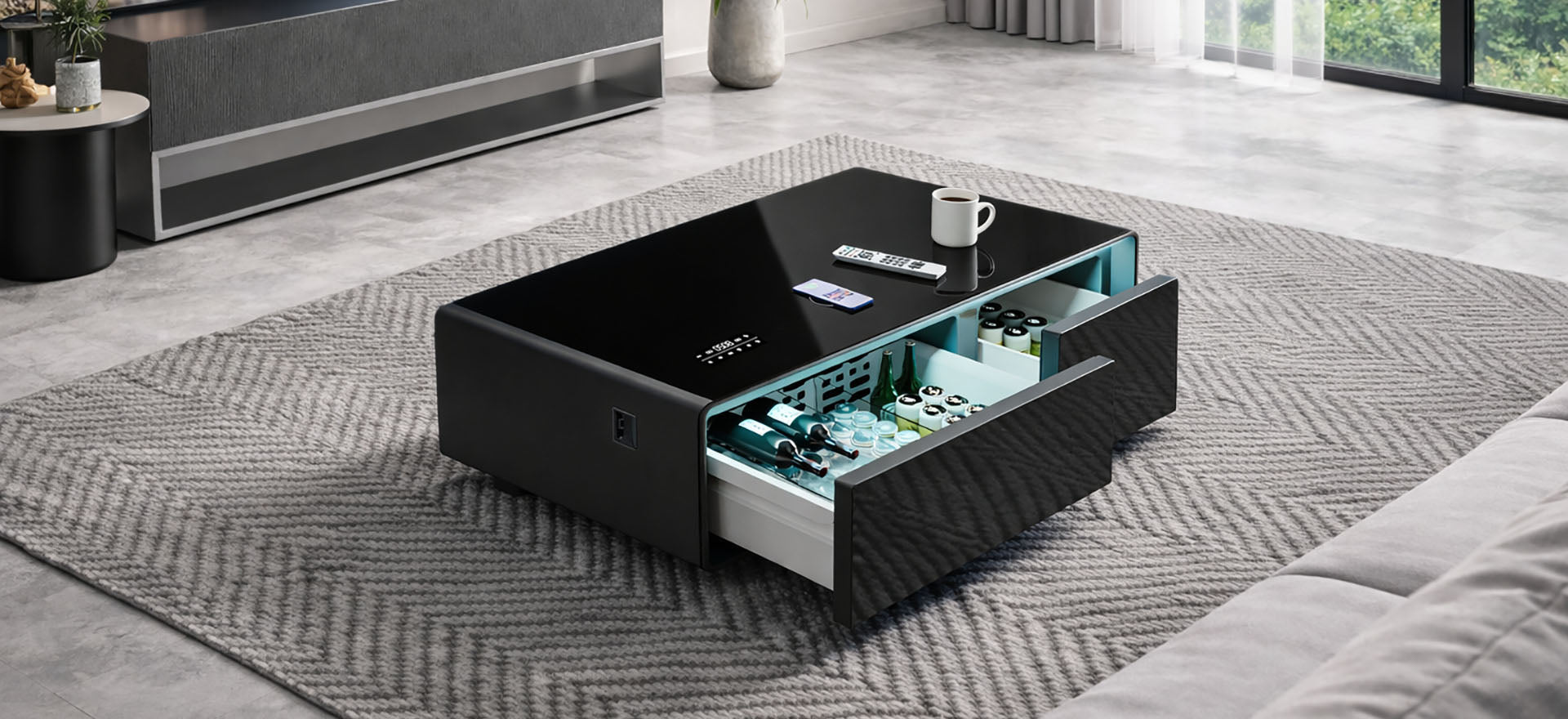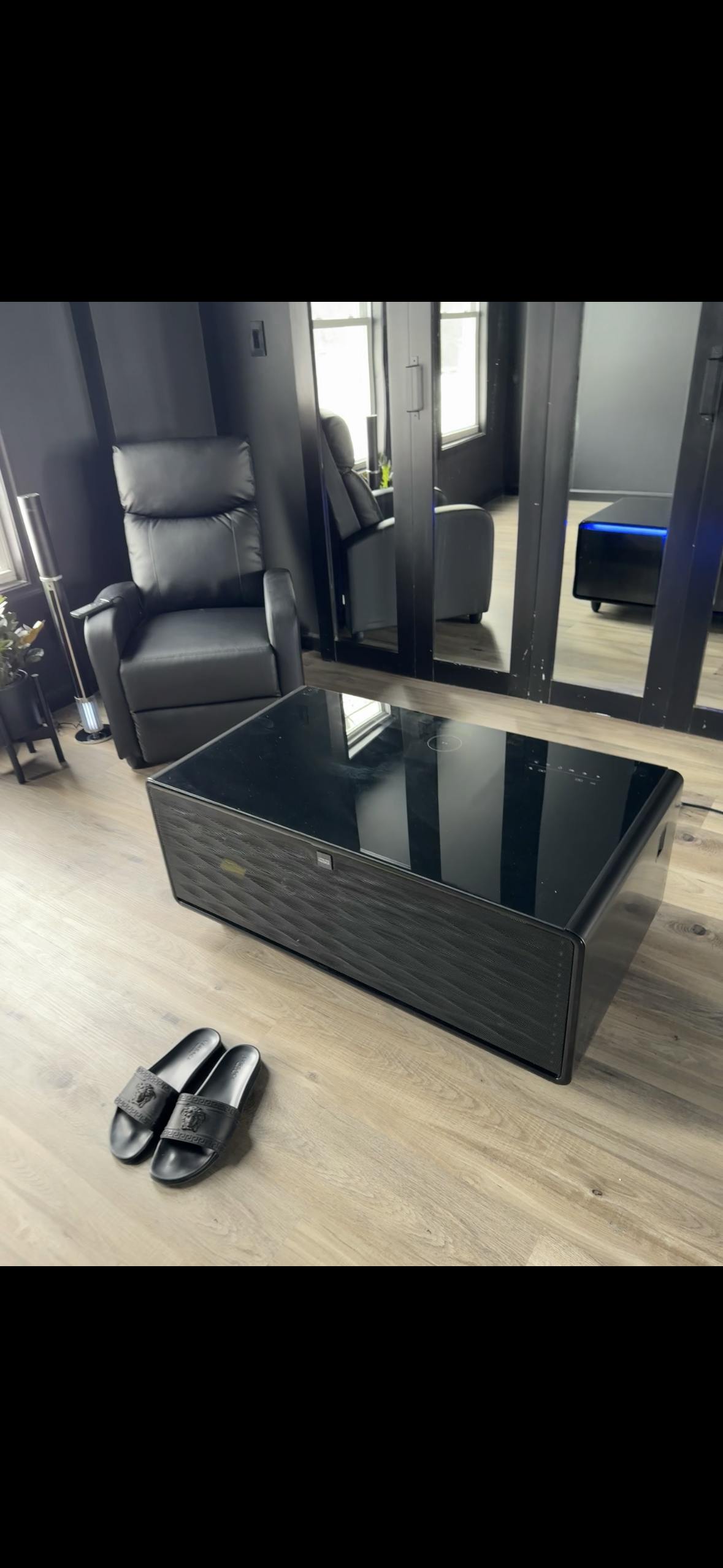 Fridge, charging, speakers, and LED lighting--this coffee table has it all. I love how functional and modern it is!