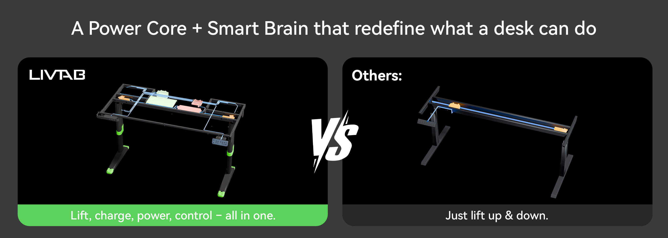 The LIVTAB CyberOne Standing Desk is a smart, motorized desk designed for creators, gamers, and professionals. Featuring dual motors for smooth height adjustment, built-in wireless charging, RGB ambient lighting, and a hidden power strip, it combines performance with style. Upgrade your workspace with this high-performance electric standing desk.