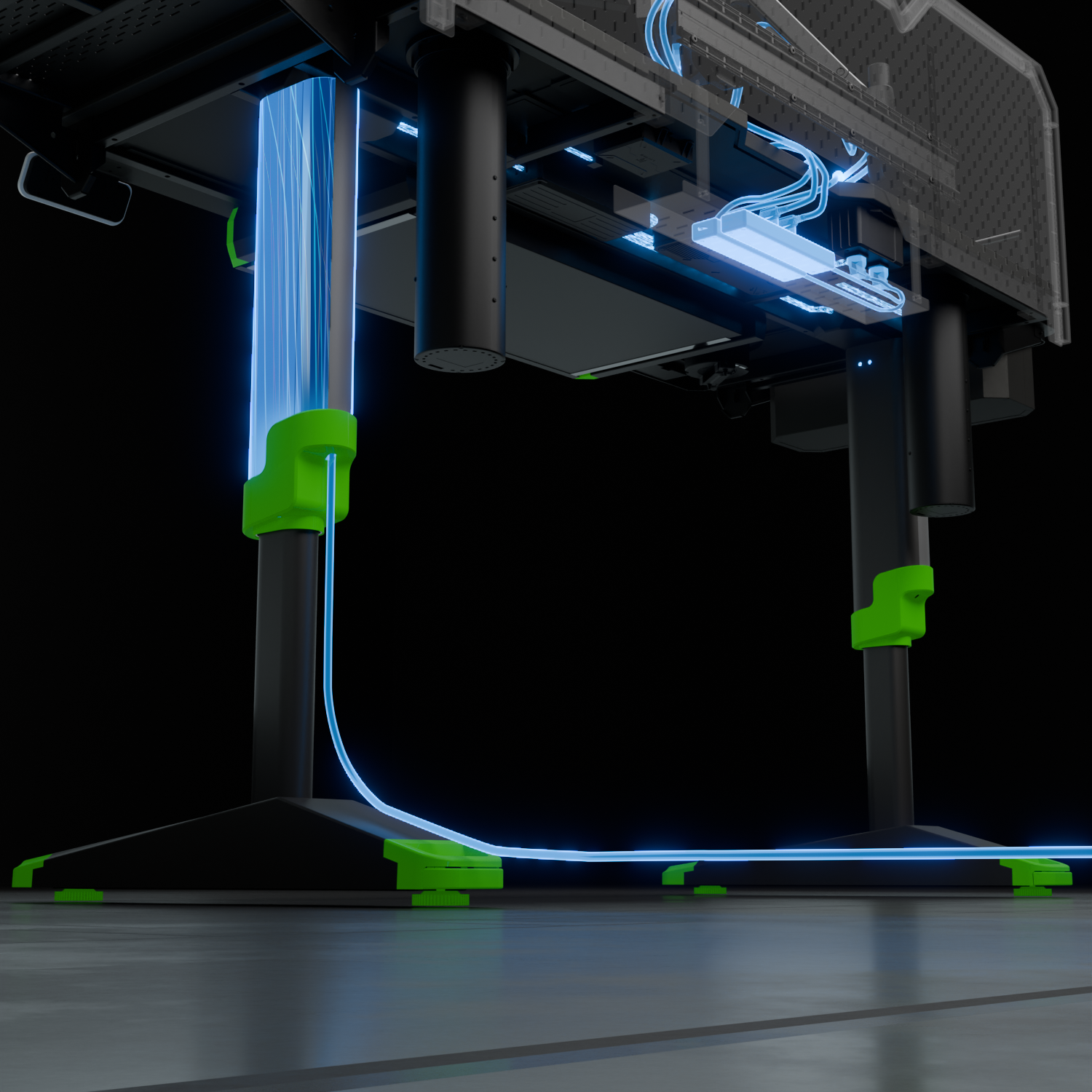 Say goodbye to messy power strips and tangled cords. A single, concealed cable within your desk leg powers the entire system. This innovative design provides a robust 2000W integrated power supply and features two built-in, standard three-prong outlets, allowing you to effortlessly power your desk and all your essential devices directly from your workstation.
